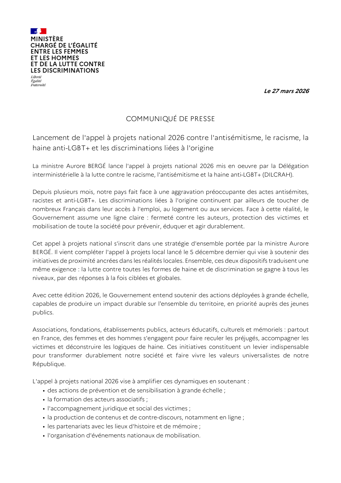 La ministre Aurore BERGÉ lance l'appel à projets national 2026 mis en œuvre par la Délégation interministérielle à la lutte contre le racisme, l'antisémitisme et la haine anti-LGBT+ (DILCRAH).