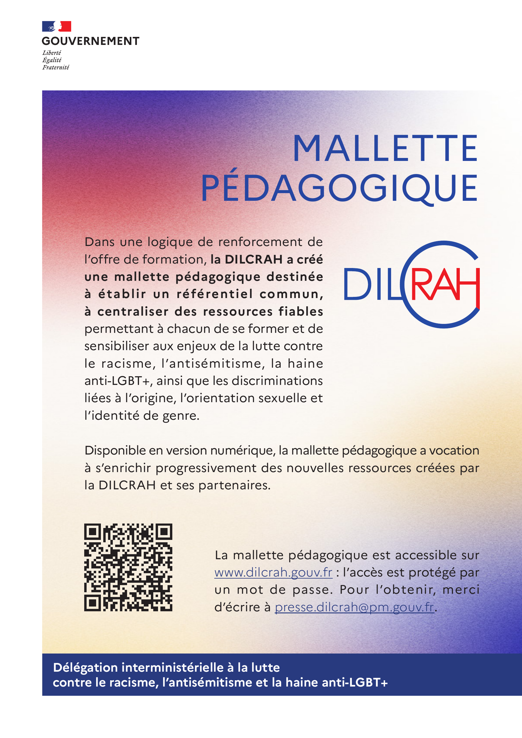 La DILCRAH met à disposition des professionnels une mallette pédagogique, destinée à se former et sensibiliser au racisme, à l'antisémitisme, aux discriminations liées à l'origine et à la haine anti-LGBT+.