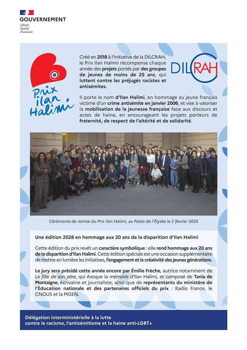 Pour participer à l’édition 2026 du Prix Ilan Halimi, il suffit de remplir le dossier de candidature (voir plus haut) et l’envoyer par mail à prix.ilan-halimi@pm.gouv.fr, en prenant soin d’y joindre des photos du projet, une vidéo ou le projet en lui même en version numérique.