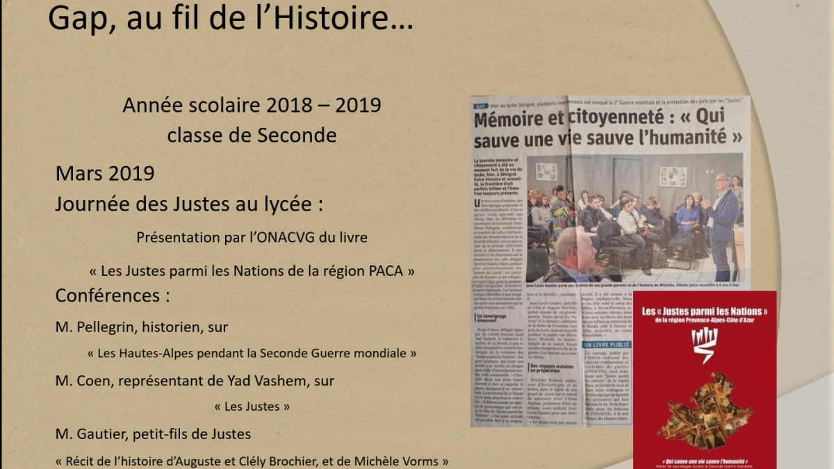 Les élèves du lycée Sévigné de Gap ont mené un travail sur 2 ans pour réaliser un livre numérique qui replace l'histoire de Gap dans le contexte de la Seconde Guerre Mondiale et de la Shoah à travers le parcours d’une famille juive cachée et en partie déportée : conférence de l'ONACGV sur "Les Alpes pendant la Seconde guerre mondiale" et "Les Justes parmi les Nations", participation à des ateliers du Mémorial de la Shoah, collecte de documents locaux, recueil de témoignages, participation aux rencontres photographiques d'Arles, ateliers de design pour la conception graphique de l'ouvrage.