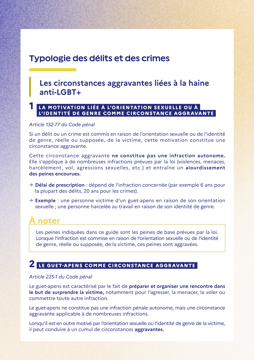 - Un guet-apens LGBTphobe correspond en réalité à une ou plusieurs infractions « autonomes », qui peuvent varier selon les situations : violences, vol, agression sexuelle.