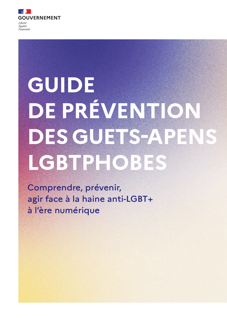 La DILCRAH met à disposition un guide de prévention des guets-apens LGBTphobes et un flyer de sensibilisation, élaboré en lien avec les associations LGBT+ et les plateformes numériques. Il contient des repères juridiques, des témoignages de victime, avocat et d'associations LGBT+, ainsi que les bonnes pratiques à adopter avant une rencontre ou en cas d'agression.