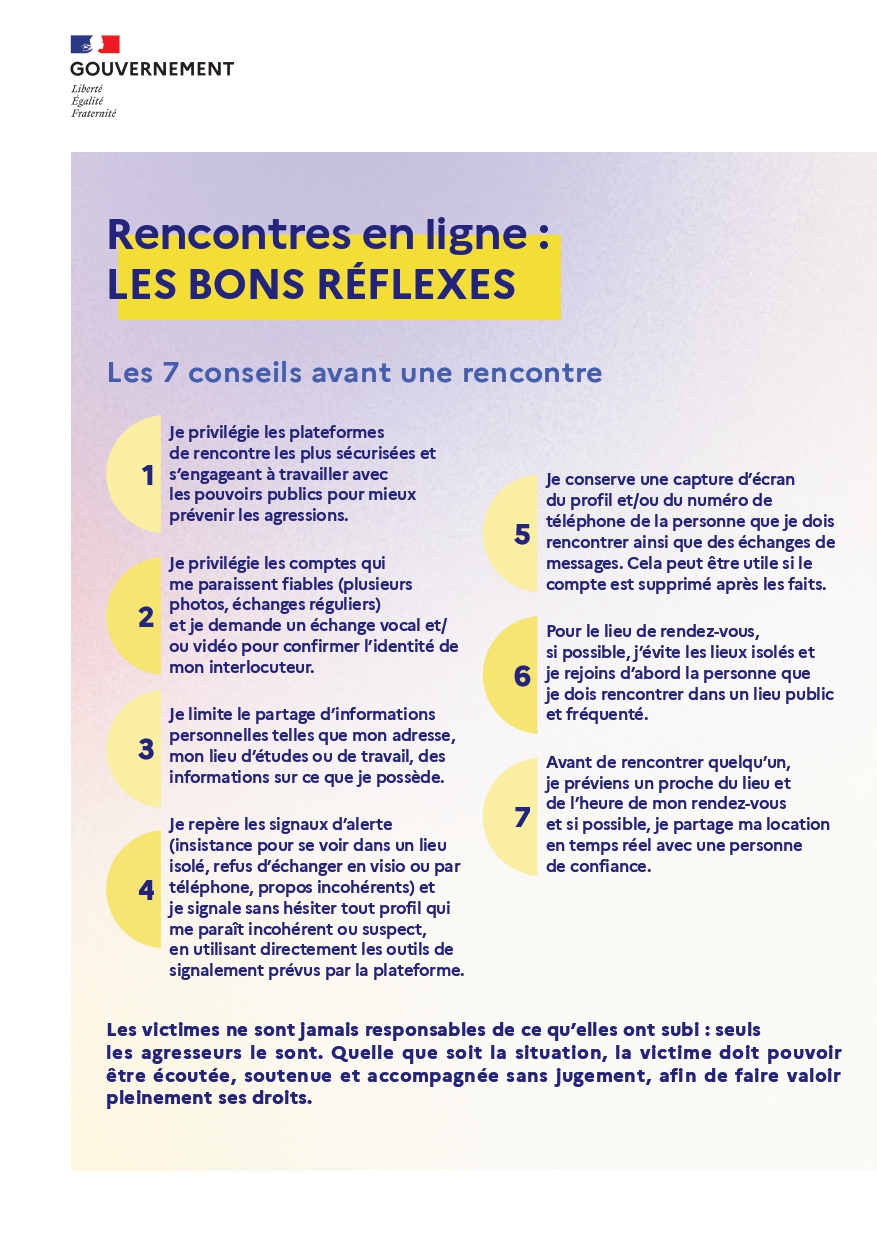 - Je privilégie les plateformes de rencontre les plus sécurisées et s’engageant à travailler avec les pouvoirs publics pour mieux prévenir les agressions grâce à leurs politiques de modération et de traitement des signalements, ainsi qu’à coopérer avec les forces de l’ordre.